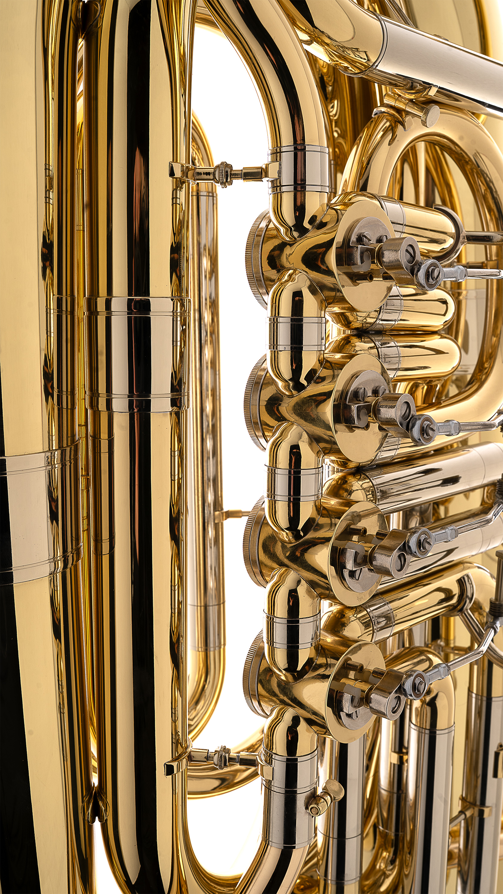 4 rotary cylinder valves, bell 420 mm, bore 21, height 940 mm, leadpipe and complete machine removable,with original FLURO steel ball linkages (made in Germany), weight 9,3 kg, lacquered, with ABS-case - large, dark tone. Easy response - a real remake of the famous Bohland & Fuchs tuba from Graslitz.