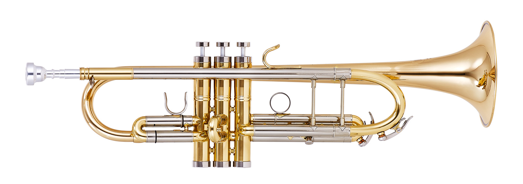 Brass lacquered, detachable heavy bell 126 mm, soldered, wire-reinforced rim, 11.7 mm ML-bore, Monel valves, 2 interchangeable lead pipes. Includes double case and mouthpiece and a set of 3 heavy caps.